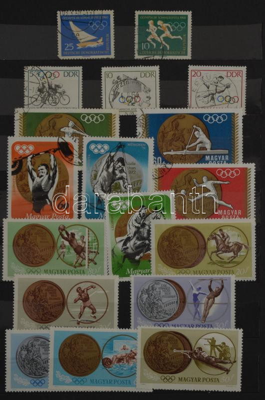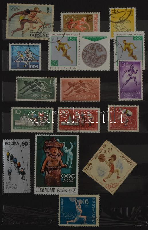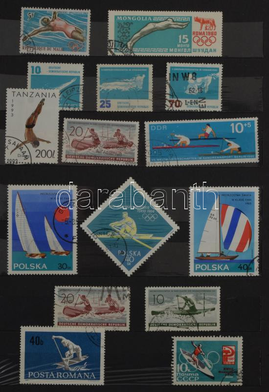 Sport motívum összeállítás, benne 185 db bélyeg 10 fekete lapos közepes berakóban, barna borítóval