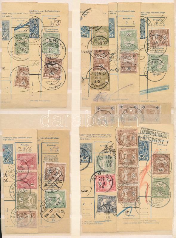 10 db csomagszállító szelvény kivágás, olvasható bélyegzésekkel, Turul bélyegekkel A/4 berakólapon