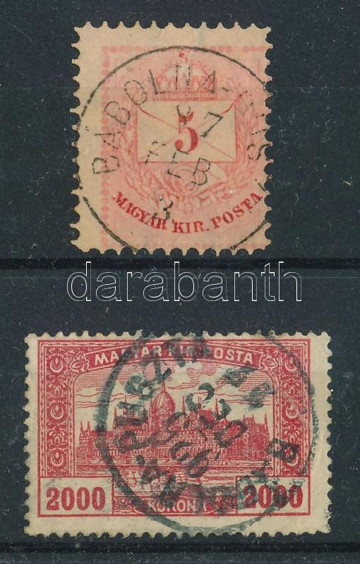 1881-1924 Színesszámú 5kr bélyeg tűfogazással + Parlament 2000K bélyeg, mindkettő "BÁBOLNA-PUSZTA" bélyegzéssel