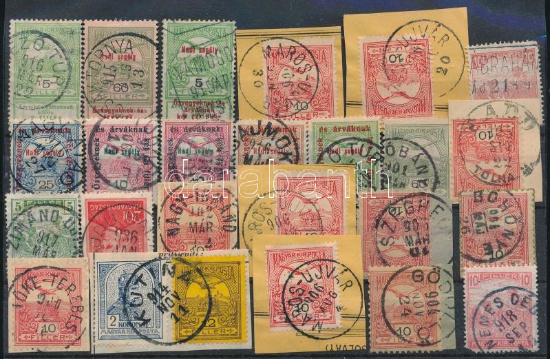 Szép egykörös bélyegzések 25 db bélyegen és kivágáson