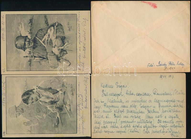 Tábori posta tétel, benne 4 db futott levelezőlap, benne kettő képes, 2 db cenzúrás levél + használatlan: 1 db vöröskeresztes, 3 db tábori