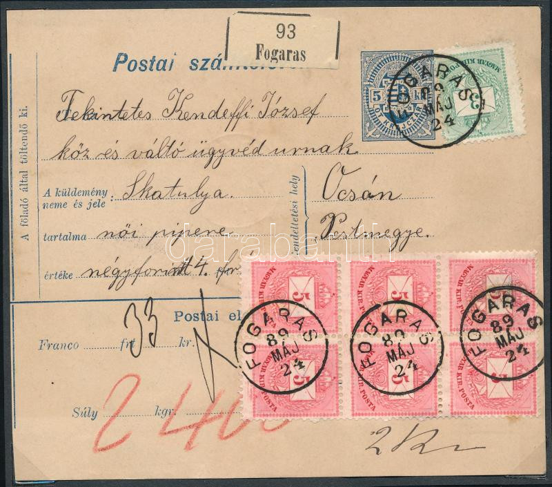 1889 Színes számú 3kr + 5kr elfogazott függőleges hatostömb látványos bérmentesítés csomagszállítón "FOGARAS" - "ÓCSA". Ex Ryan