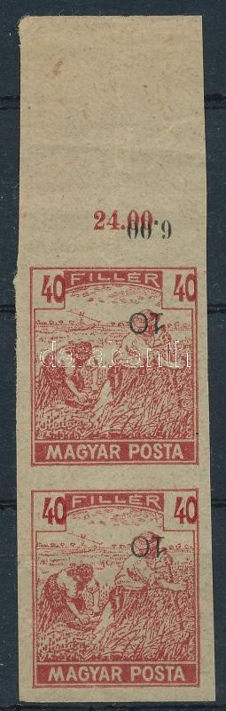 1919 Magyar Posta kármin 40f vágott ívszéli próbanyomat pár elcsúszott értékszámokkal, vízjel és enyvezés nélküli papíron, melyet korábban a Turul 10f értékszám próbanyomatához használtak. A fekete 10-es értékszámok fordítottak.