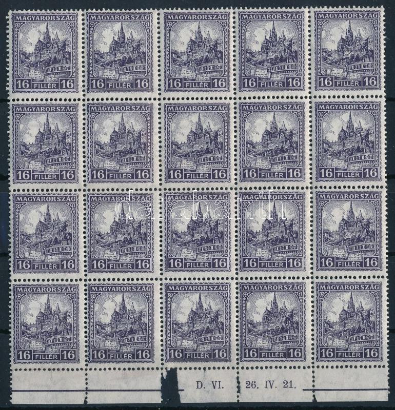 1926 Pengő fillér "A" feketésibolya 16f ívszéli huszas tömb ...