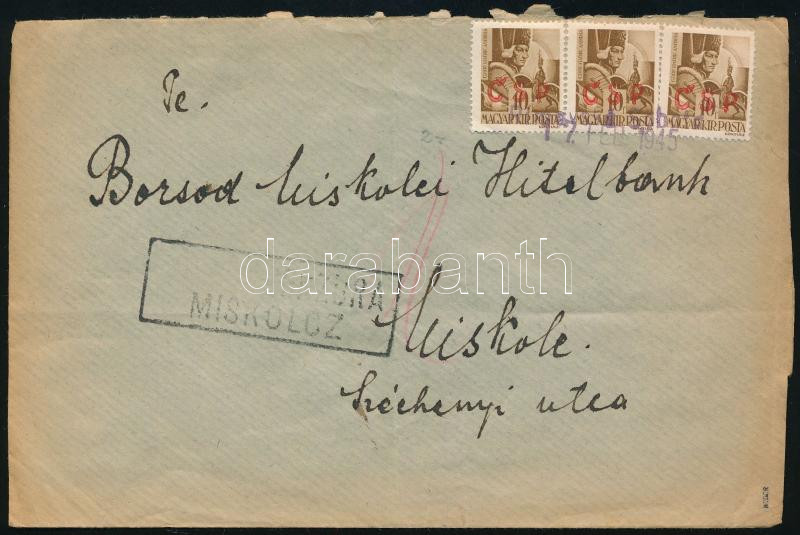 Rimaszombat 1945 Levél piros CSP felülnyomású Hadvezérek 3 x 10f bérmentesítéssel "Rimavská Sobota" szükségbélyegzéssel Miskolcra, Bodor vizsgálójellel