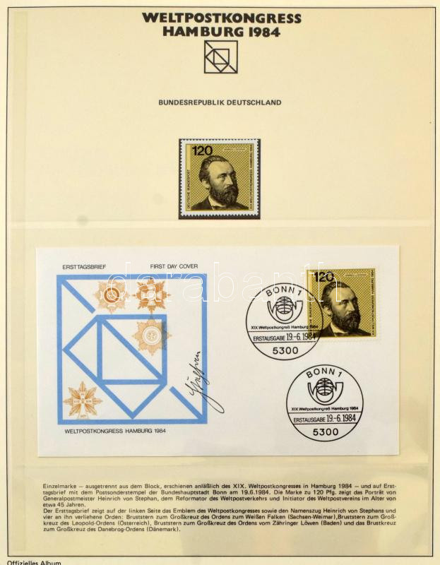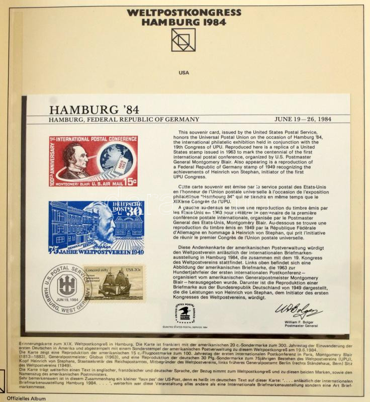 Hamburgi postaügyi kongresszus hivatalos albuma, benne sok alkalmi kiadvány, falcmentes előnyomott albumban, gyűrűs borítóval, tokkal