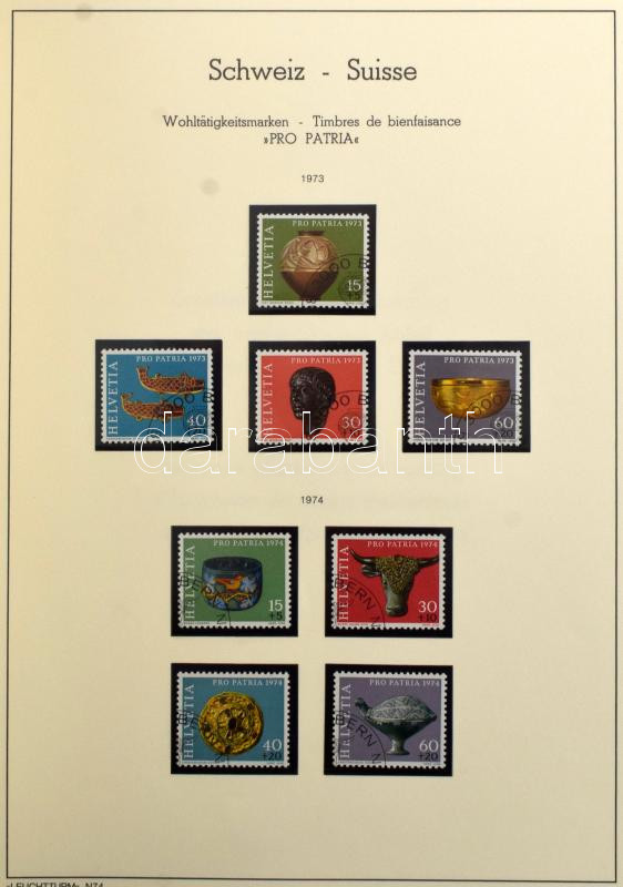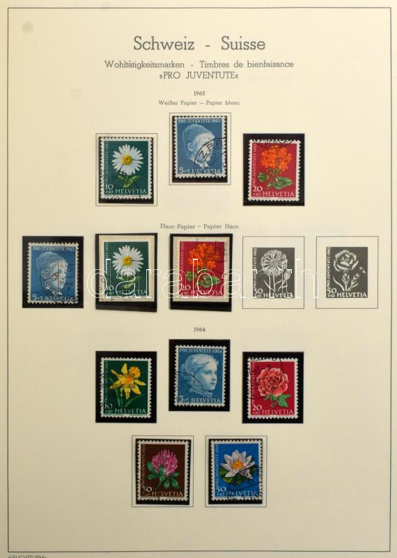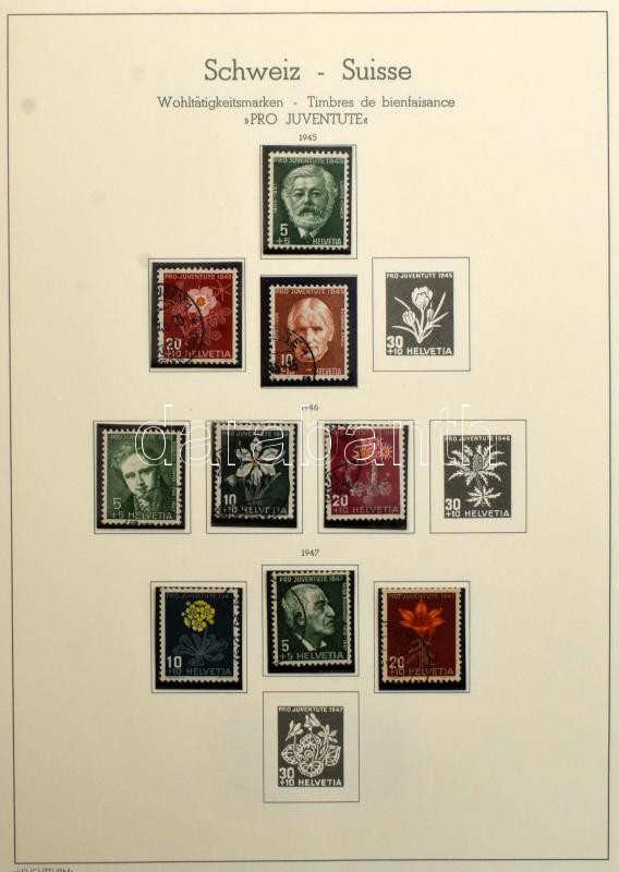 Svájc 1945-1974 Pro Juventute és Pro Patria bélyegek előnyomott Leuchtturm lapokon, csavaros Schaubek fedéllel, filázva: 202 db bélyeg és 3 blokk