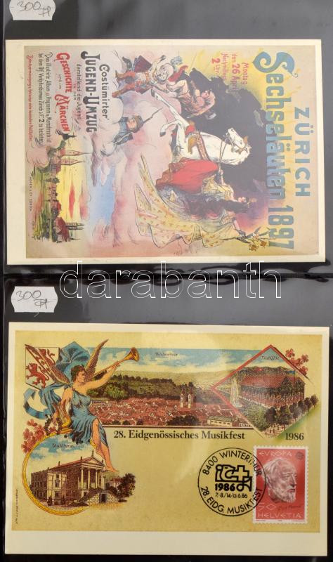 Svájc és Liechtenstein FDC-k, modern alkalmi légi levelek, postatörténeti képeslapok 2 db A4-es és 3 fekvő levél berakóban. Szép anyag!