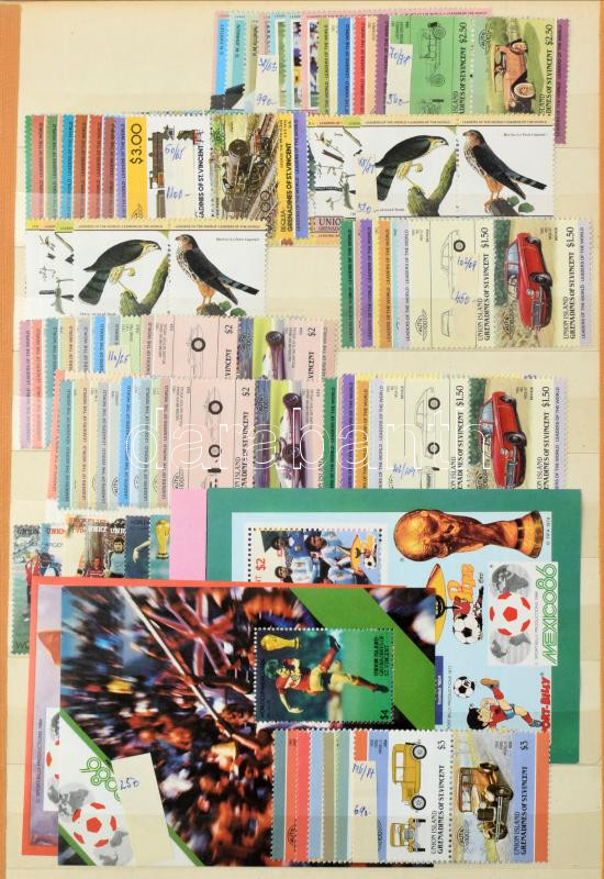 Szép motívum gyűjtemény másodpéldányokkal, főleg Karibi országok vonat, autó, madár, sport, labdarúgás, brit királyi család, stb. kiadásaiból részben blokkokkal + kevés egyéb