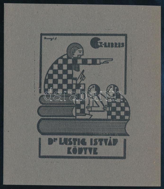 Dinnyés Ferenc (1886-1958): Ex Libris, Dr. Lustig István könyve. Klisé, papír, jelzett a nyomaton, 8×6 cm