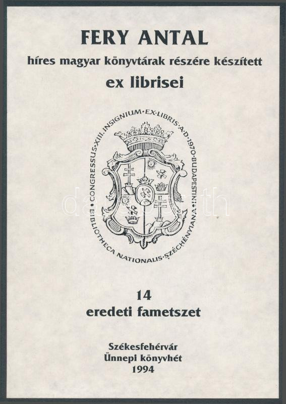 Description: Fery Antal (1908-1994): Híres magyar könyvtárak részére készített ex librisei, 13 db. Fametszet, papír, mindegyik jelzett a metszeten, klf. méretekben. Vörösmarty Mihály Megyei Könyvtár kiadása. Eredeti kiadói, számozott (31/70 sz.) mappában. 1 db hiányzik!