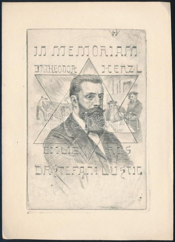 Hölzer-Weinek, Irene (-): In memoriam Theodor Herzl, ex libris Dr. Stefani Lustig (judaika ex libris), rézkarc, papír, jelzett a karcon, 14x9 cm