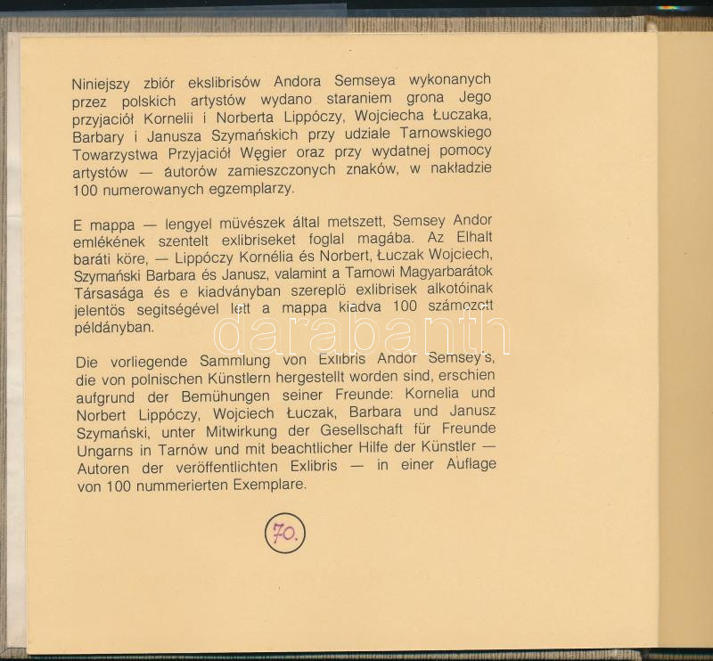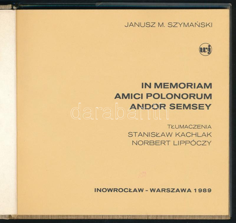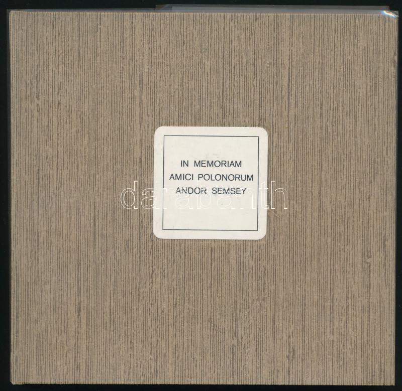 Description: Janusz M. Szymanski: In memoriam amici polonorum Andor Semsey. Varsó, 1989, Inowroclaw. Magyar, lengyel és német nyelven. Számozott: 70/100. Kiadói kötésben, kiadói beragasztott kisgrafikákkal.