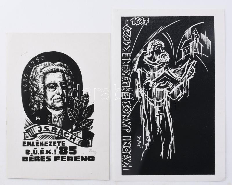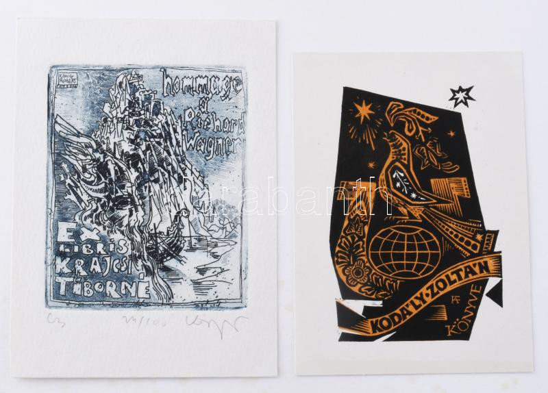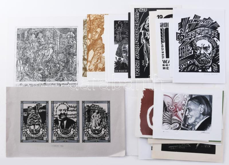 Klf. alkotók magyar és külföldi alkotók (Józsa János, Fery Antal, König Róbert, Sárkány Győző, Vén Zoltán, Torró Vilmos stb.): Zeneszerzőkkel (Bartók Béla, Kodály Zoltán, Richard Wagner, Egressy Béni, Erkel Ferenc, Bach stb.) illusztrált ex libris és kisgrafika tétel, össz. kb. 52 db. Klf. technikák, papír, többségében ceruzával jelzett. Klf. méretekben.