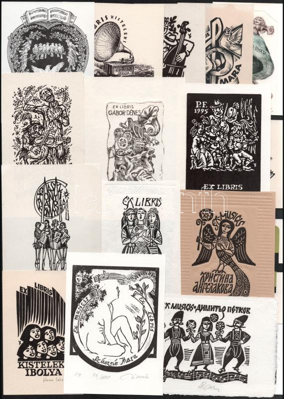 Description: Klf. magyar és külföldi alkotók (Gáborjáni Szabó Kálmán, Hegedűs 2 László, Ürmös Péter, Vincze László, Stettner Béla stb.): Zenei témájú ex libris és kisgrafika tétel, össz. 17 db. Klf. technikák, papír, többségében ceruzával jelzett. Klf. méretekben.