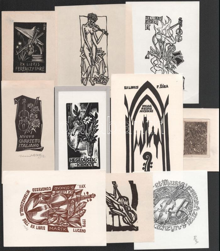Klf. magyar és külföldi alkotók (Gy. Szabó Béla, Vén Zoltán, Perei Zoltán, Kazinczy Gábor, Stetner Béla, Vertel József stb.): Vonós hangszerekkel és azokon játszó alakokkal illusztrált ex libris és kisgrafika tétel, össz. 23 db. Klf. technikák, papír, többségében ceruzával jelzett. Klf. méretekben.