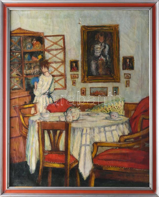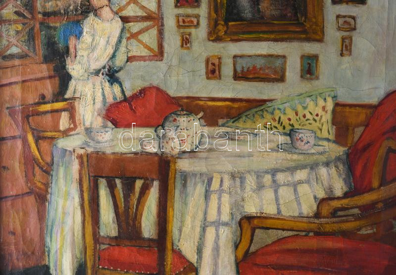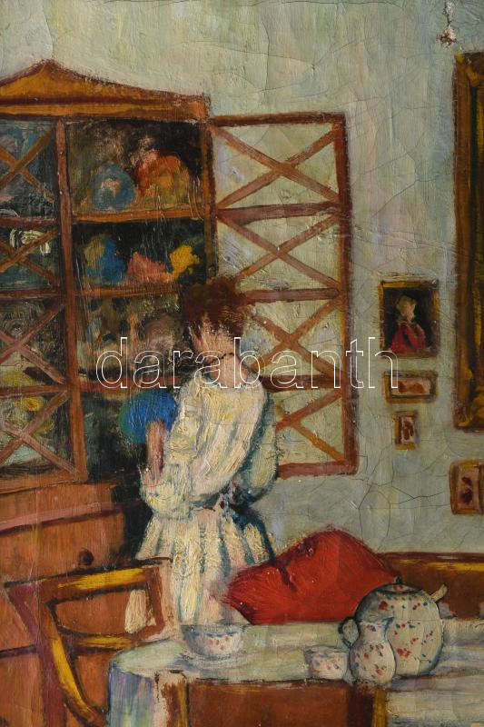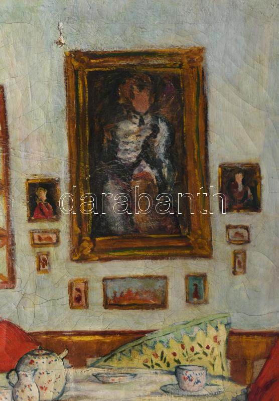 Jelzés nélkül, XX. sz. eleje: Enteriőr festményekkel. Olaj, vászon. Proveniencia: Saphier-gyűjtemény. Javított. Sérült. Dekoratív, kissé sérült fakeretben. 69,5x55 cm