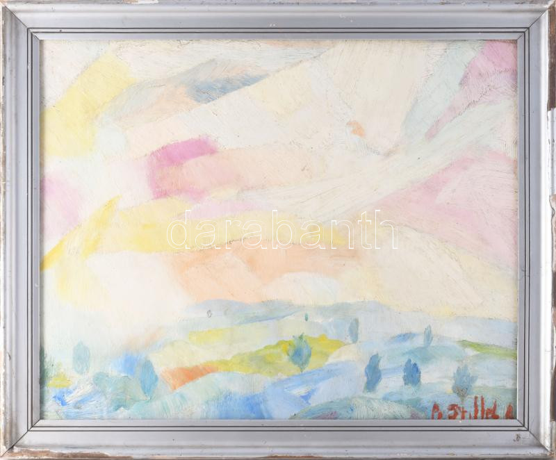 Olvashatatlan jelzéssel, XX. sz. első fele: Színes táj. Olaj, fa. Hátoldalán régi, kissé töredékes raglappal. Dekoratív, sérült fakeretben. 40x50 cm