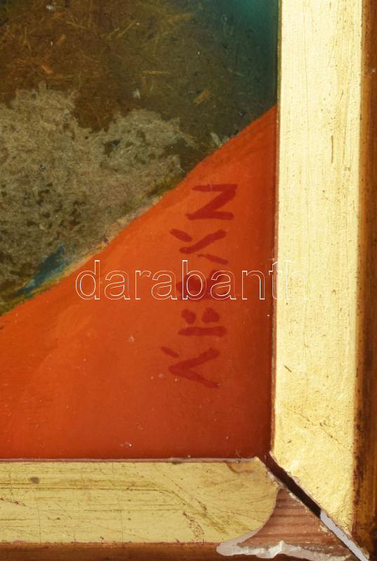 Description: Ábrán Zoltán (1906-1986): Nefretiti, egyiptomi lányok. Olaj, farost, jelzett 60x50 cm Sérült keretben, hátoldalán címke a művész autográf feliratával. .