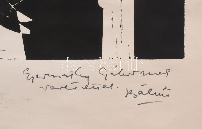 Bálint Endre (1915-1986): Bálint Endre kiállítása. 1967, Esztergom, Balassa Bálint Múzeum. Kiállítási plakát. Linómetszet, papír, jelzett, Bálint Endre autográf ajándékozási soraival (Rádóczi) Gyarmathy Gábor részére. Lapszéli apró szakadásokkal, gyűrődésekkel. 85×60 cm.