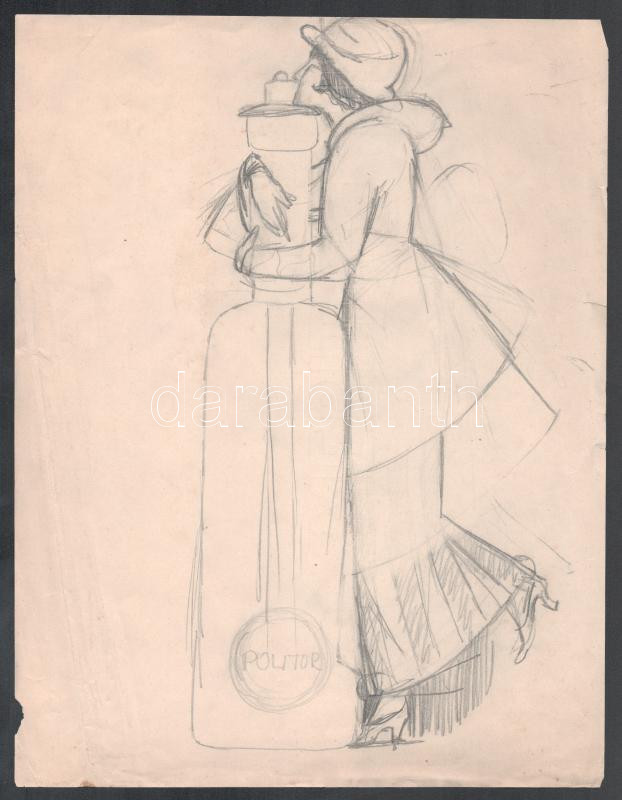 Boér Lenke (1885-1956): Politor (reklám rajz). Ceruza, papír, jelzés nélkül, hátoldalán feliratozott. Lap széle kissé sérült. 30x23,5 cm