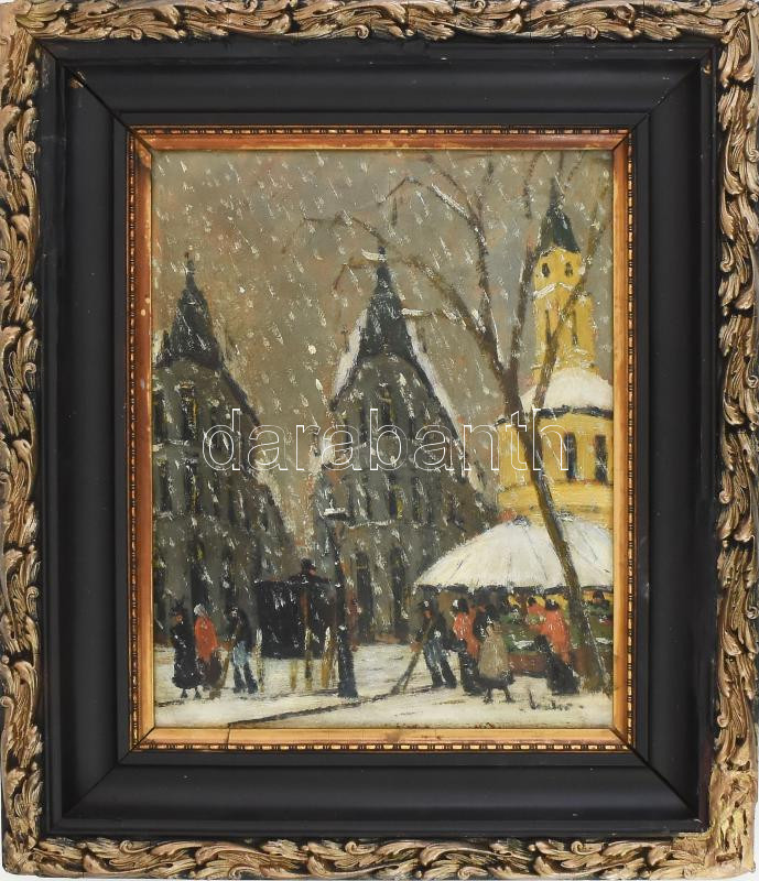 Czakó Rezső (működött a 20. sz. első felében): Havas Párisi utca. Olaj, karton, jelzett, 29x22 cm. Dekoratív fakeretben.