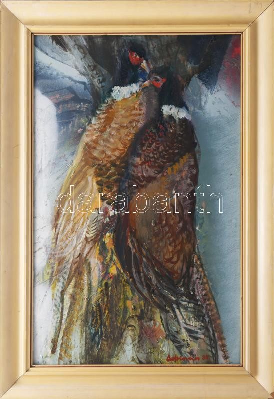 Dobrovits Ferenc (1941-1988): Fácánok, 1985. Olaj, farost, jelezve job... https://www.darabanth.com/en/514-Paintings-posters-ex-libris-auction/516.0/Paintings-and-graphics/Paintings-and-graphics~8/Dobrovits-Ferenc-1941-1988-Facanok-1985-Olaj-farost-jelezve-jobbra-lent-Hatoldalan-autog~II3476180