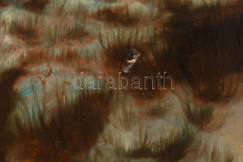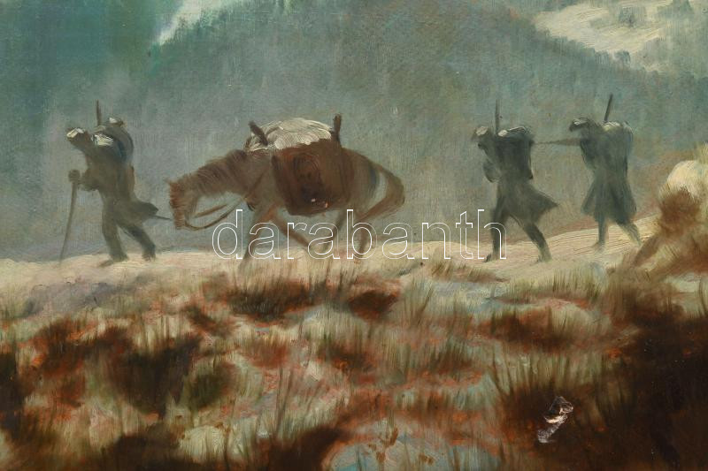 Description: Ijjász Gyula (1874-1943): Első világháborús katonák Uzsoknál (Kárpátalja), 1915. keretben. Olaj, karton, jelzett. Sérült. Dekoratív fakeretben. 48x70 cm
