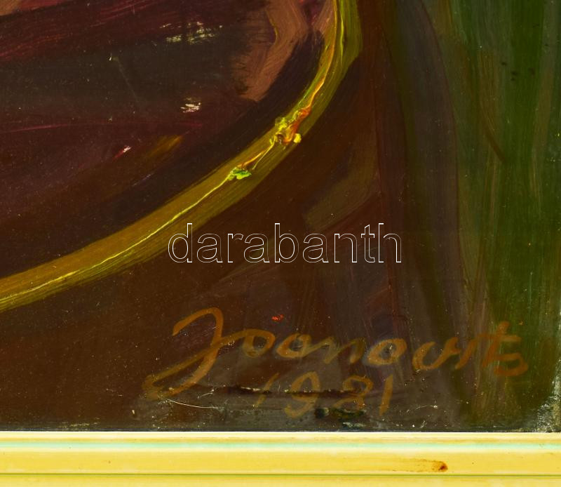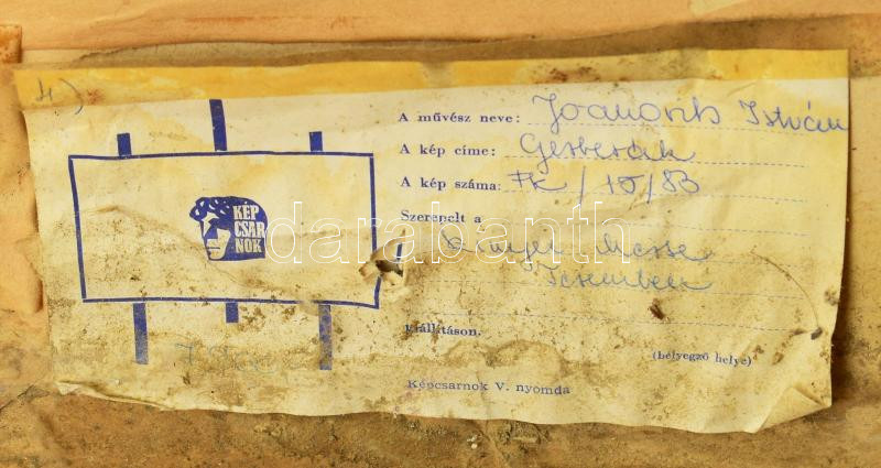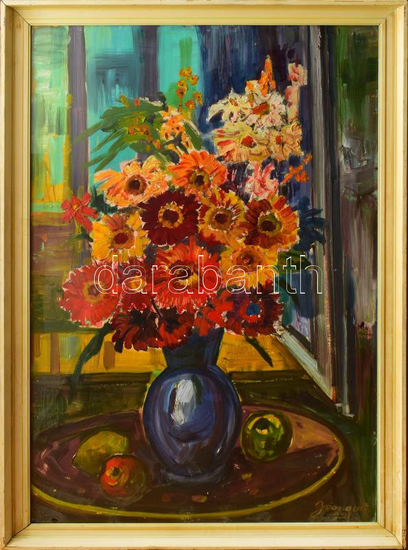 Joanovits István (1912-1995): Gerberák, 1981. Olaj, farost, jelzett. Hátoldalán Képcsarnok Vállalat címkéjével, mely szerint szerepelt a Szinyei Merse Teremben, Szekszárdon, 1981-ben rendezett kiállításon. Üvegezett, kissé sérült fakeretben. 100×70 cm. KIZÁRÓLAG SZEMÉLYES ÁTVÉTEL, NEM POSTÁZZUK! / ONLY PERSONAL COLLECTION AT OUR OFFICE!