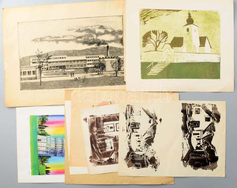 Description: Kaubek Péter (1942-) Vegyes grafikák, linómetszetek, rézkarcok, aquatinta, 9 db, közötte Csatárka úti gyermekváros rézkarc, vegyes méretben + 1 db egyéb grafika
