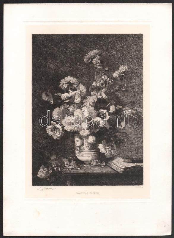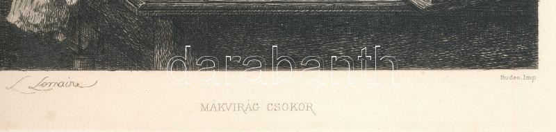 Description: Louis Marie Lemaire (1824-1910): Mákvirág csokor. Rézkarc, papír, jelzett a karcon. Az 1884-ben megjelent Életképek. Jelenkori művészek találkozója. Husz rézkarcz c. mappából. Lapszéli apró elszíneződésekkel. 24x17 cm