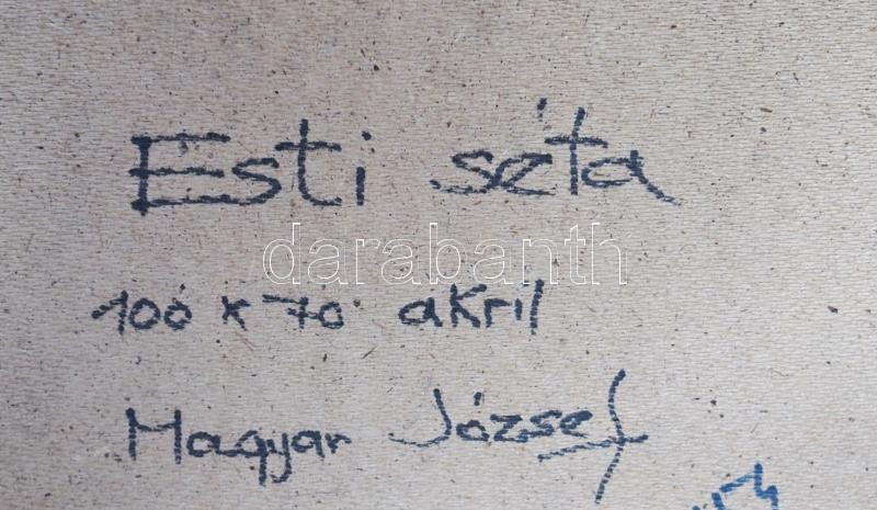 Description: Magyar József (1957-): Esti séta. Akril, farost, jelezve jobbra lent. Hátoldalán autográf felirattal. Dekoratív, kissé sérült fakeretben. 100x70 cm. KIZÁRÓLAG SZEMÉLYES ÁTVÉTEL, NEM POSTÁZZUK! / ONLY PERSONAL COLLECTION AT OUR OFFICE!