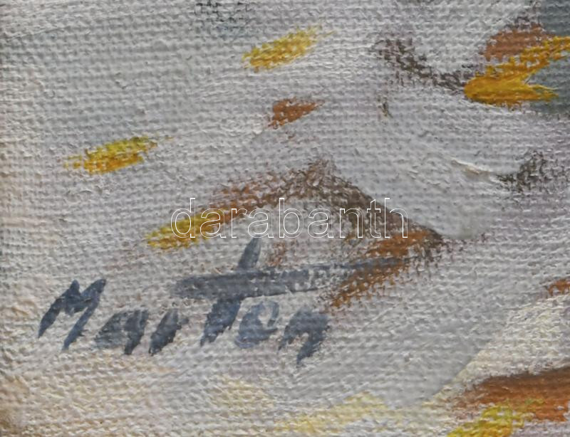 Description: Márton Béla (1913-2007): Havas táj. Olaj, vászon, jelezve balra lent, hátoldalán Zichy Mihály Alkotóközösség raglapjával, dekoratív fakeretben, 50×70 cm