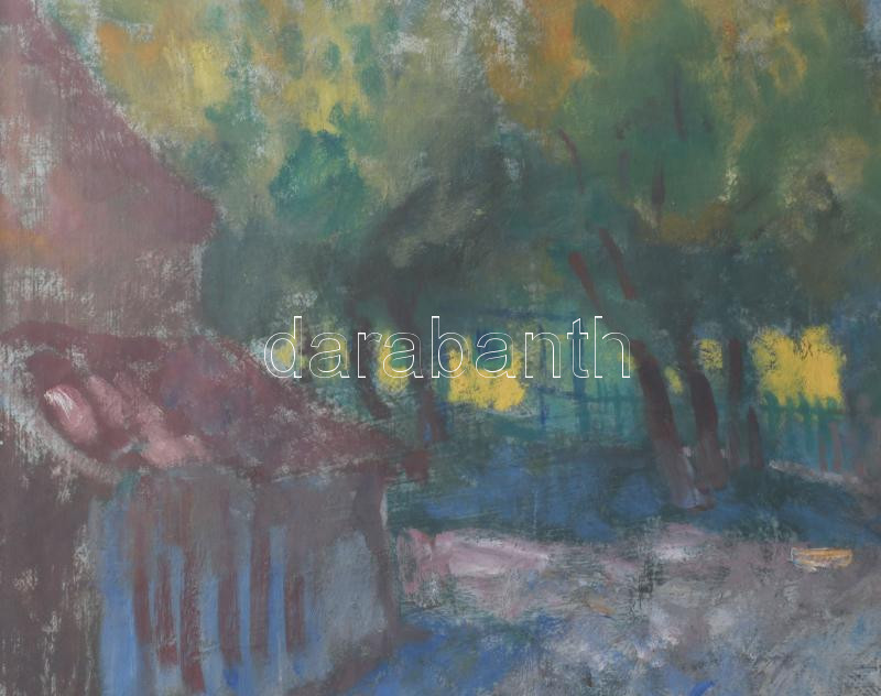 Miháltz Pál (1899-1988): Szentendrei utca, 1957. Olaj, vászon. Jelezve jobbra lent. Hátoldalán autográf felirattal és Képcsarnok Vállalat címkéivel. 42x54 cm. Üvegezett, dekoratív fakeretben.