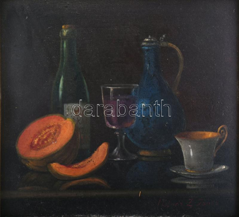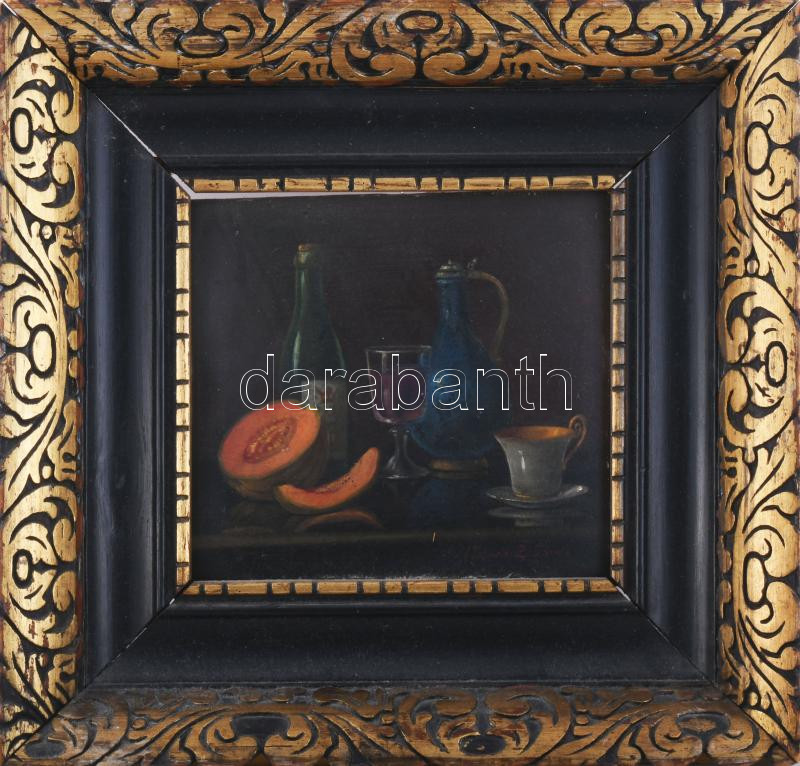 Molnár Z. János (1880-1960): Csendélet dinnyével és palackokkal. Olaj, karton, jelezve jobbra lent. Dekoratív fakeretben, 20x23 cm