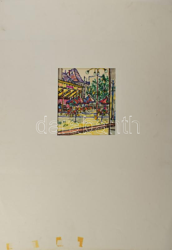 Description: Nolipa István Pál (1907-1986): Nyári cukrászda, Budapest, 1971. Színes tus, papír. Jelezve jobbra lent. Hátoldalán autográf felirattal és Magyar Nemzeti Galéria kiviteli bélyegzővel. Paszpartuban. 19x16 cm