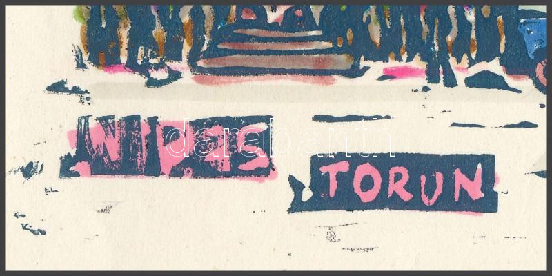 Nolipa István Pál (1907-1986): Torun, utcarészlet (Lengyelország), 1975. Színezett linómetszet, papír. Jelzett a metszeten. 18x25 cm.