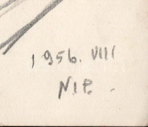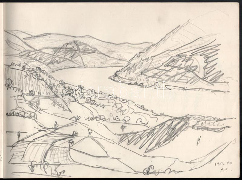 Nolipa István Pál (1907-1986): Vázlatfüzet össz. 9 db rajzzal (Dunakanyar, alakok, portré, gyárépület, stb.), 1950-es évek. Tus, ceruza, szén, papír. 2 db rajz jelzett. Egy lap kijár. 25,5x34,5 cm