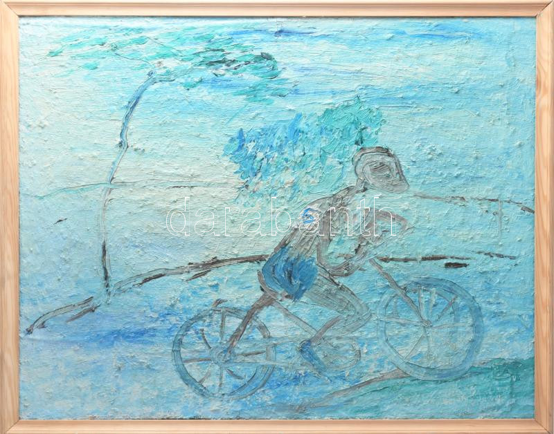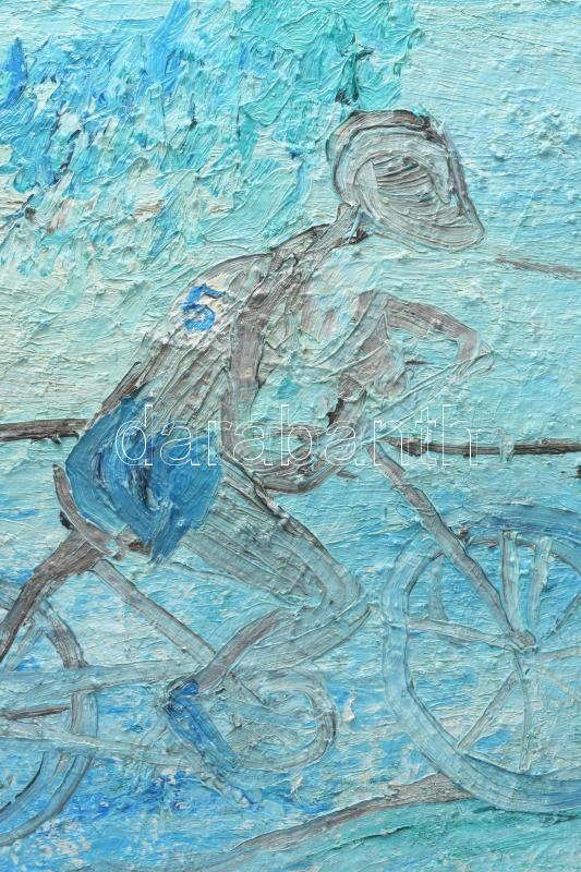 Papp Sándor (1953-): Kerékpárverseny 2. Olaj, vászon, faroston. Jelzet... https://www.darabanth.com/en/514-Paintings-posters-ex-libris-auction/516.0/Paintings-and-graphics/Paintings-and-graphics~8/Papp-Sandor-1953-Kerekparverseny-2-Olaj-vaszon-faroston-Jelzett-a-hatoldalan-Reproduk~II3481533