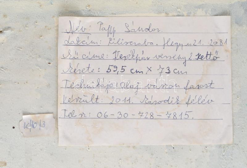 Description: Papp Sándor (1953-): Kerékpárverseny 2. Olaj, vászon, faroston. Jelzett a hátoldalán. Reprodukálva: Szabó Lajos (szerk.): Ezüstgerely 2011., oldalszám nélkül. 59,5x73 cm. Fakeretben.