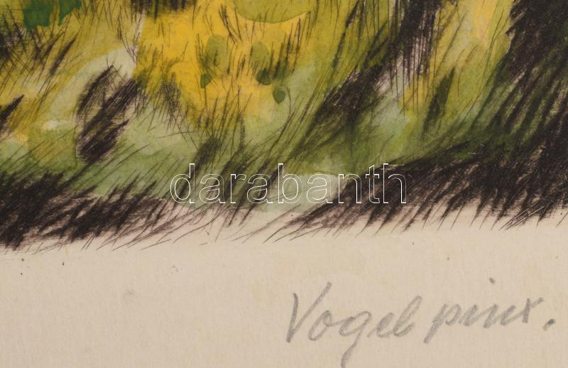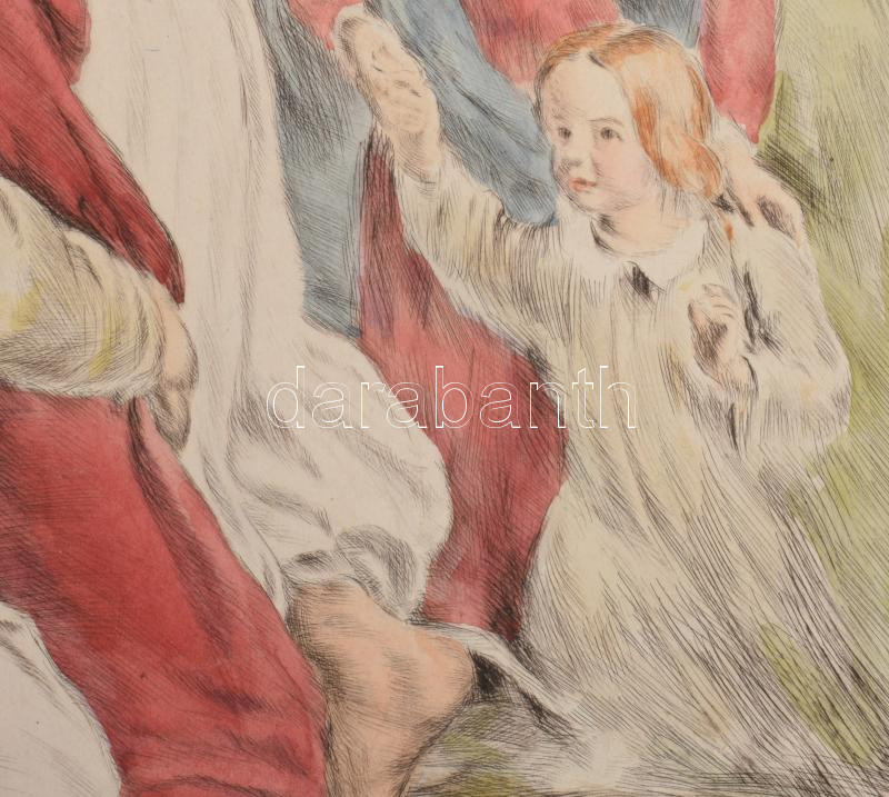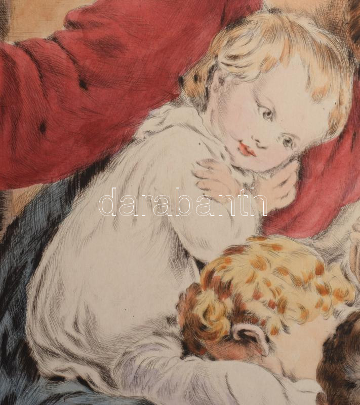 Prihoda István (1891-1956), C. Vogel pinx: Engedjétek hozzám... (Jézus gyerekekkel). Színezett rézkarc, papír, jelzett (Vogel pinx). Lapszéli elszíneződésekkel. 63×48 cm.