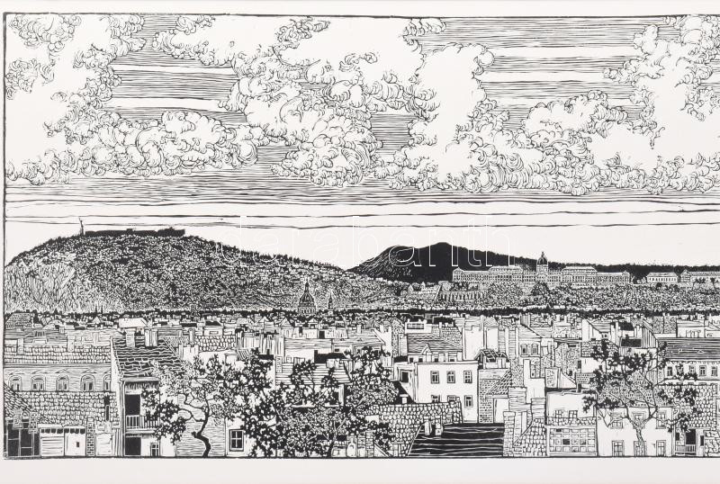 Stettner Béla (1928-1984): Budapest látképe a város egyesítésének 100. évfordulóján. Fametszet, papír. Jelzett. Paszpartuban. 28×69,5 cm