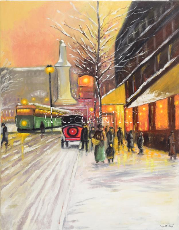 Szendrei József (1989-, "Pesti Józsi"): Nagyvárosi forgatag. Olaj, vászon. Jelezve jobbra lent. 70x53,5 cm.