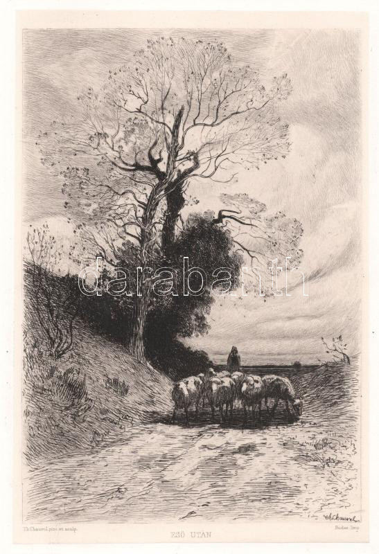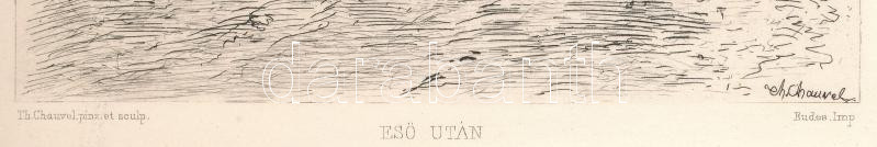 Description: Theophile Narcisse Chauvel (1831-1914 k.): Eső után. Rézkarc, papír, jelzett a karcon. Az 1884-ben megjelent Életképek. Jelenkori művészek találkozója. Husz rézkarcz c. mappából. Lapszéli apró foltokkal. 23x15,5 cm