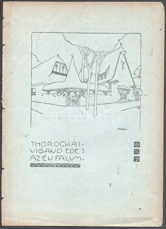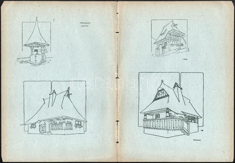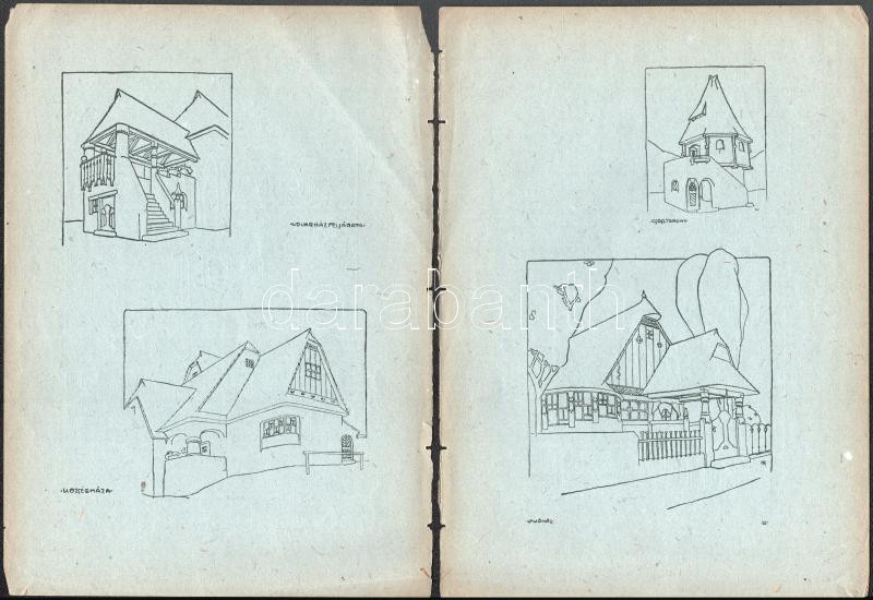 Thorockai-Vigand Ede (1870-1945): Az én falum Fametszet papír, jelezve a dúcon, 17 db különböző funkciójú, de egységes arculatú épület terve. (iskola, községháza, disznóól, stb) 8 oldalas kiadvány, merített papíron 20x28,5 cm .Ritka.