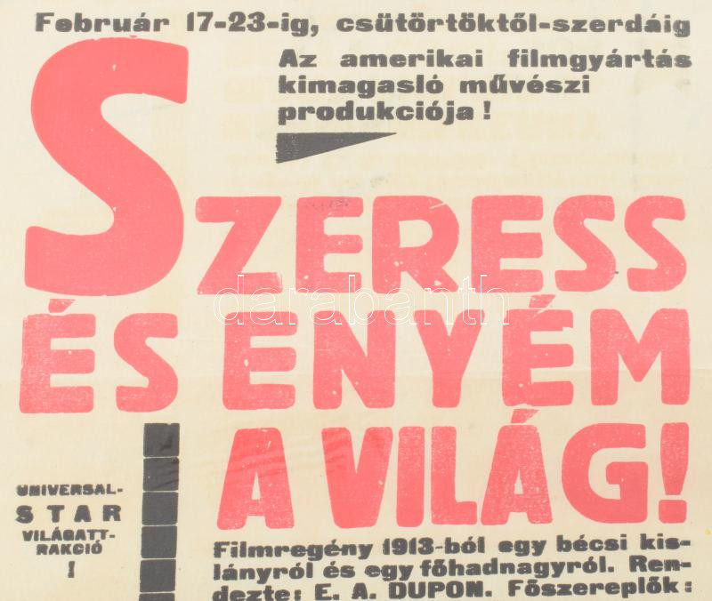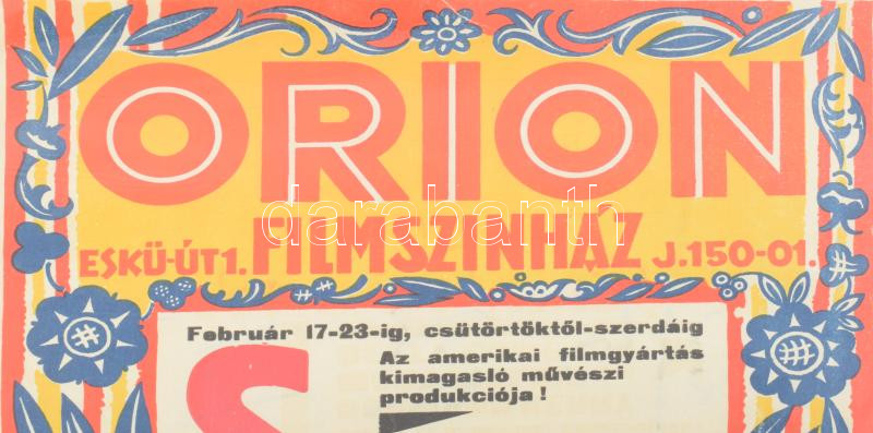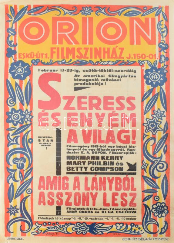1926 Orion Filmszínház, Bp., Eskü út 1. Szeress és enyém a világ! Amíg a lányból asszony lesz. Színes art deco filmplakát, műsorplakát, litográfia, papír, Weisz R 926 jelzéssel a plakáton, Lit. Gottlieb, Schultz Béla és Tsa, szakadásokkal, hajtásnyomokkal, korábban feltekerve, 47x31 cm. Rendkívül ritka!