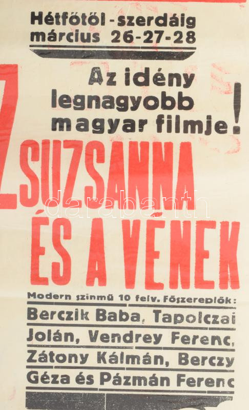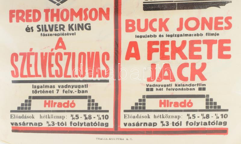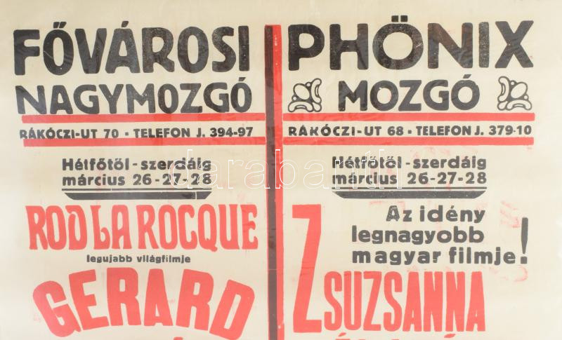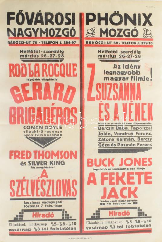 1928 Fővárosi Nagymozgó, Phönix Mozgó, Bp., Rákóczi út 68/70. Színes filmplakát, műsorplakát, papír, jelzés nélkül, Thalia Kultura Rt. Apró lapszéli szakadással, hajtásnyomokkal, korábban feltekerve, 47x31,5 cm. Rendkívül ritka!
