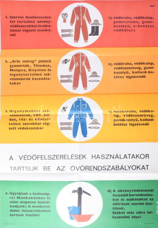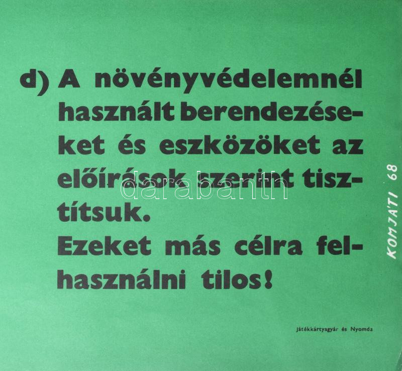 Description: 1968 Védőfelszerelések, plakát, papír, Komjáti 68 jelzéssel a plakáton, Játékkártyagyár és Nyomda, hajtásnyomokkal, apró lapszéli szakadással, 83x56 cm