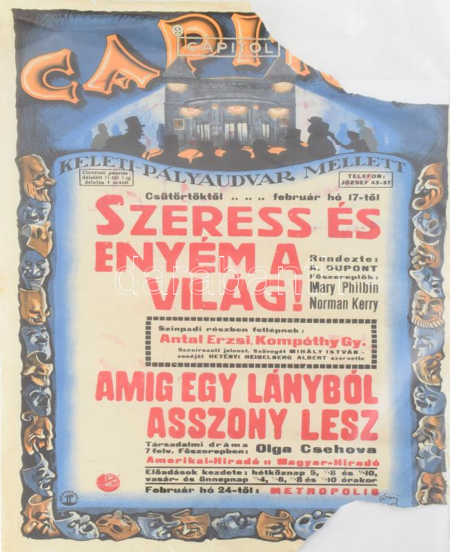 Description: cca 1927 Sátori Lipót (Sátory, 1899-1943): Szeress és enyém a világ! Amíg egy lányból asszony lesz; február hó 24-tól: Metropolis. Capitol mozi (Keleti pu. mellett). Színes litografált art deco filmplakát, papír, jelzett a plakáton, erősen sérült, 47x31,5 cm. Rendkívül ritka!