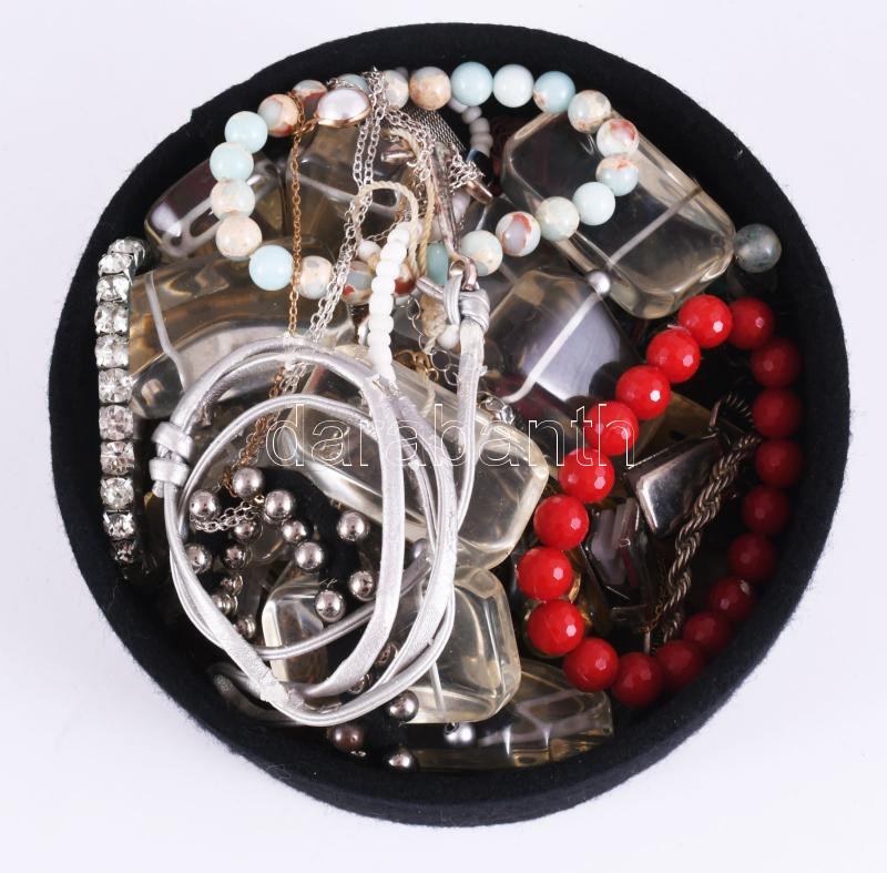 Iparművész díszdoboz, tele klf bizsuval, közte érdekes darabokkal.